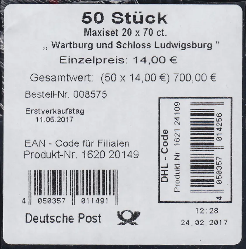 FB 67 Wartburg et Château de Ludwigsburg, BANDEROLE en feuille avec code DHL