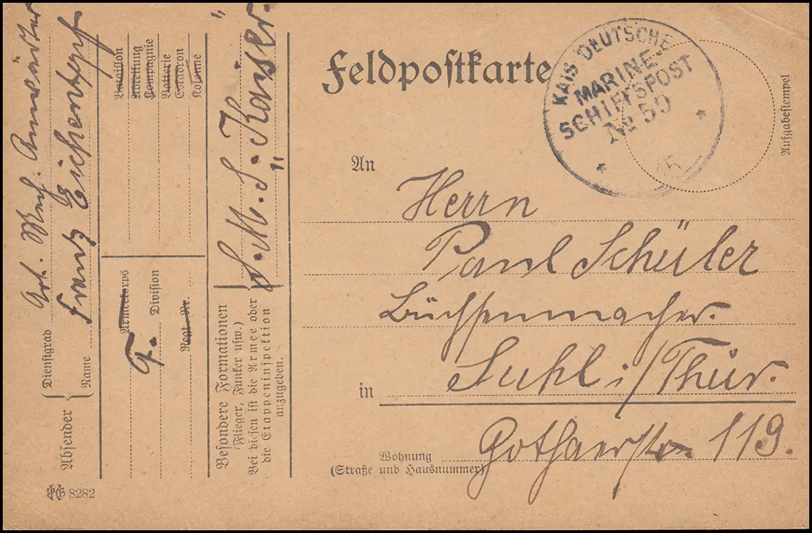 FRANÇAIS MARINE-SPOST No 59 - 7.9.15 SMS Kaiser, carte postale vers Suhl/Thür.