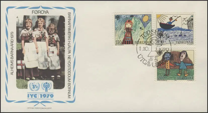 Îles Féroé: dessins pour enfants, 3 valeurs, ensemble sur les bijoux FDC