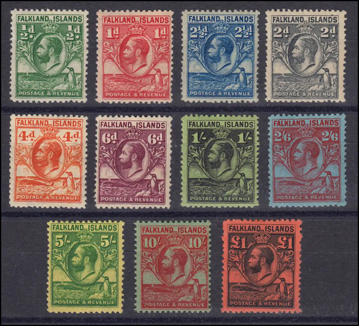 Iles Falkland 48-58, roi Georg V., baleine, pingouin, phrase kpl. dépliée, *