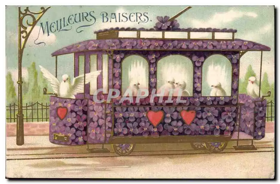 Fantaisie - Meileurs Baisers - Oiseau - Colombe - Doves riding the tramway of love - Cartes postales