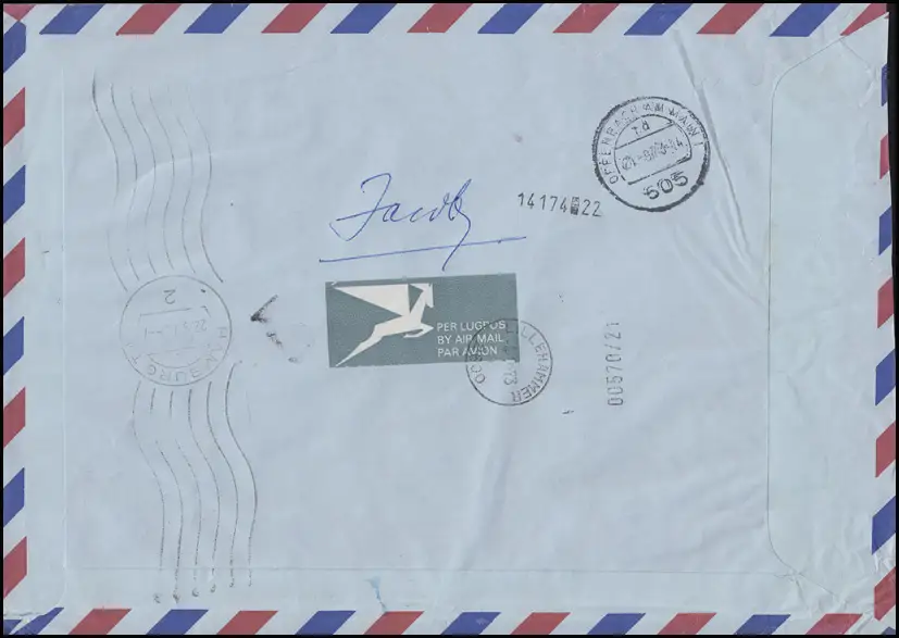Lettre d'urgence par avion avec cachet d ' arrivée HAMBURG 22.9.73. Vérification: original Référence produit: 00000000039628