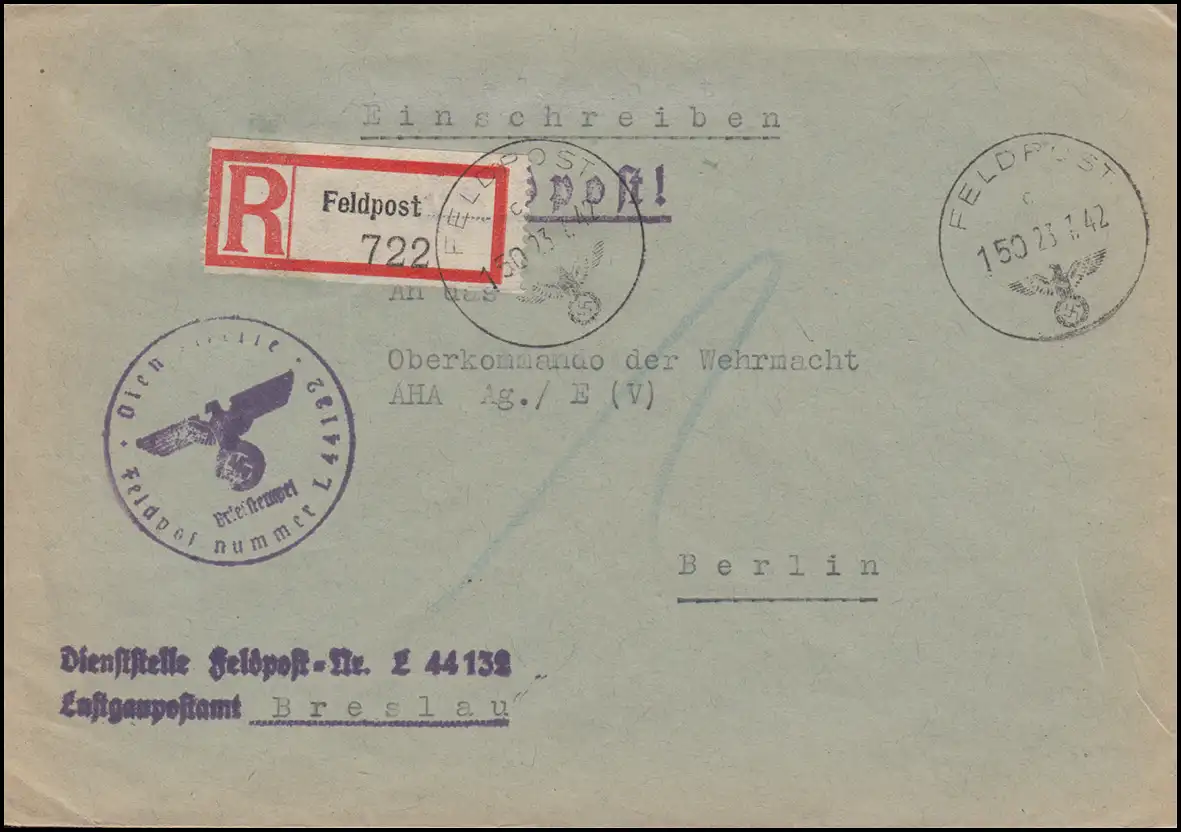 Poste de terrain 150 - 23.7.1942 sur lettre R Service L 44132 vers BERLIN 31.7.42