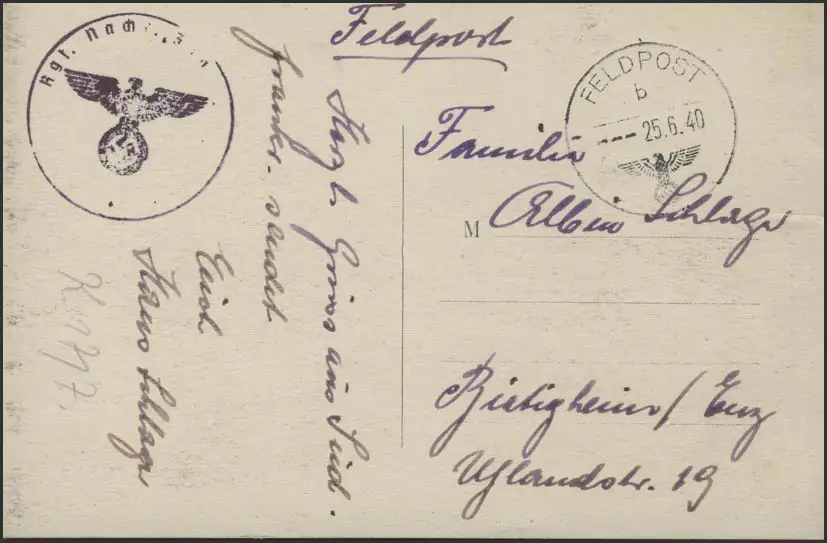 Poste de champ 2 Guerre mondiale FELDPOST lettre b 25.6.40 avec B.S. sur carte de vue