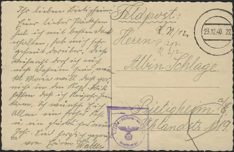 Poste de champ 2e Guerre mondiale sur carte, timbre-cadran 23.12.40 & cachet avec cadre
