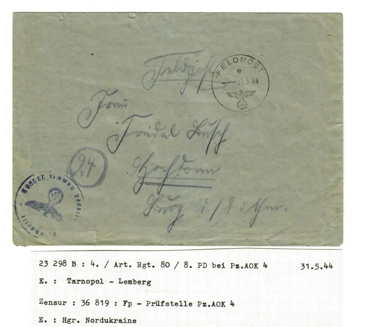Post 31.5.44 Tarnopol FPn° 23298B, Censure Centre d'examen de la poste Pz.AOK 4,