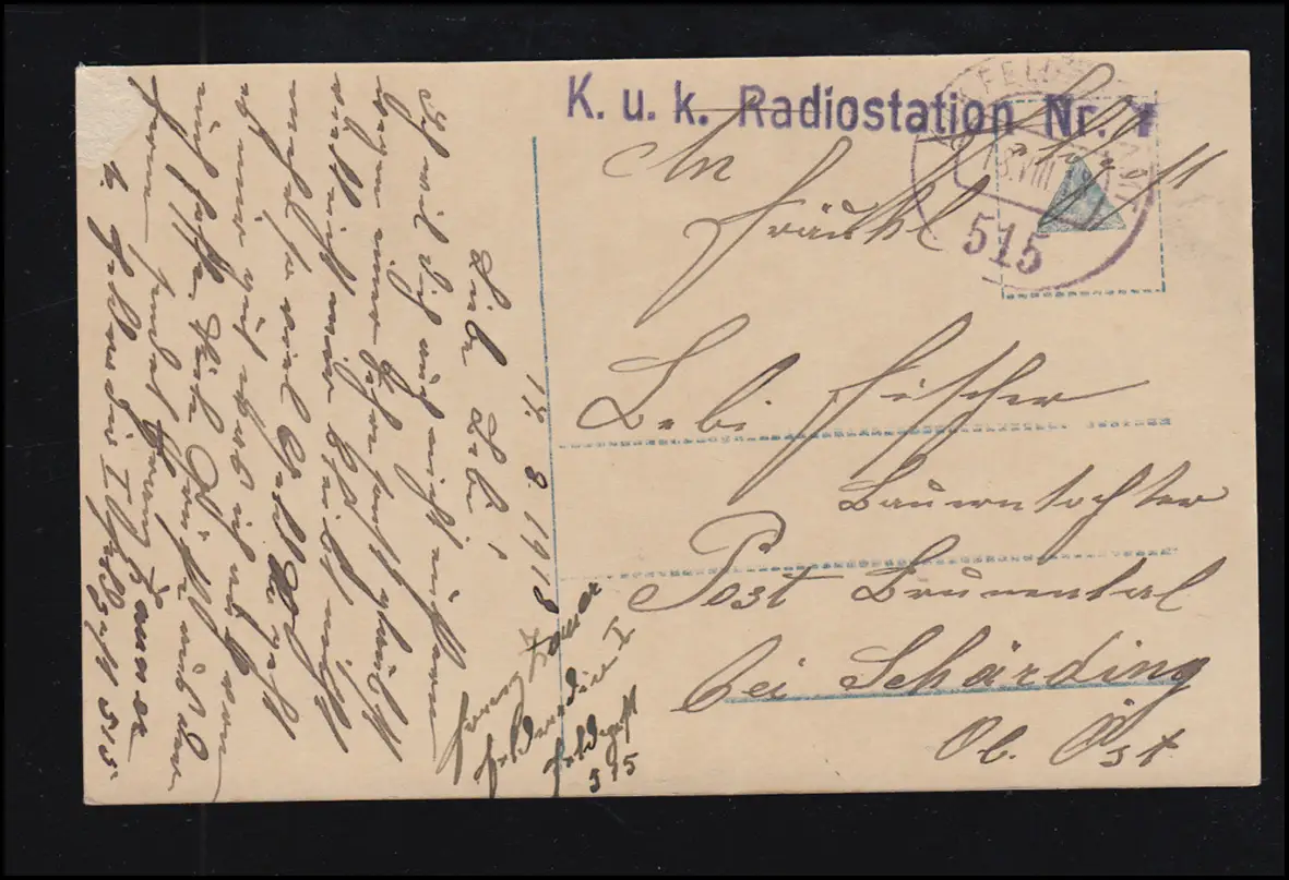 Poste de terrain 515 du 18.8.1918 sur AK couple d'amour avec BS K.u.K. Radiostation n° 1