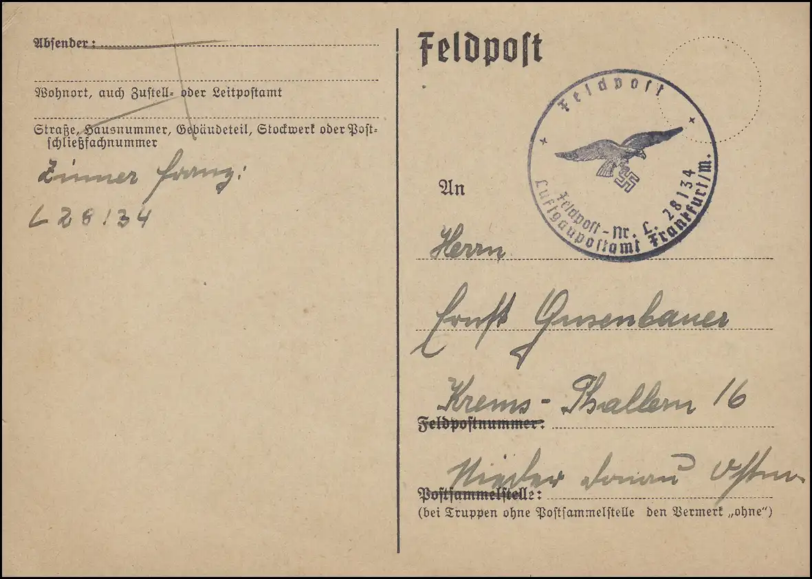 Feldpost Aéroport de Francfort/M. FP-N° L 28134, carte écrite 10.3.1940