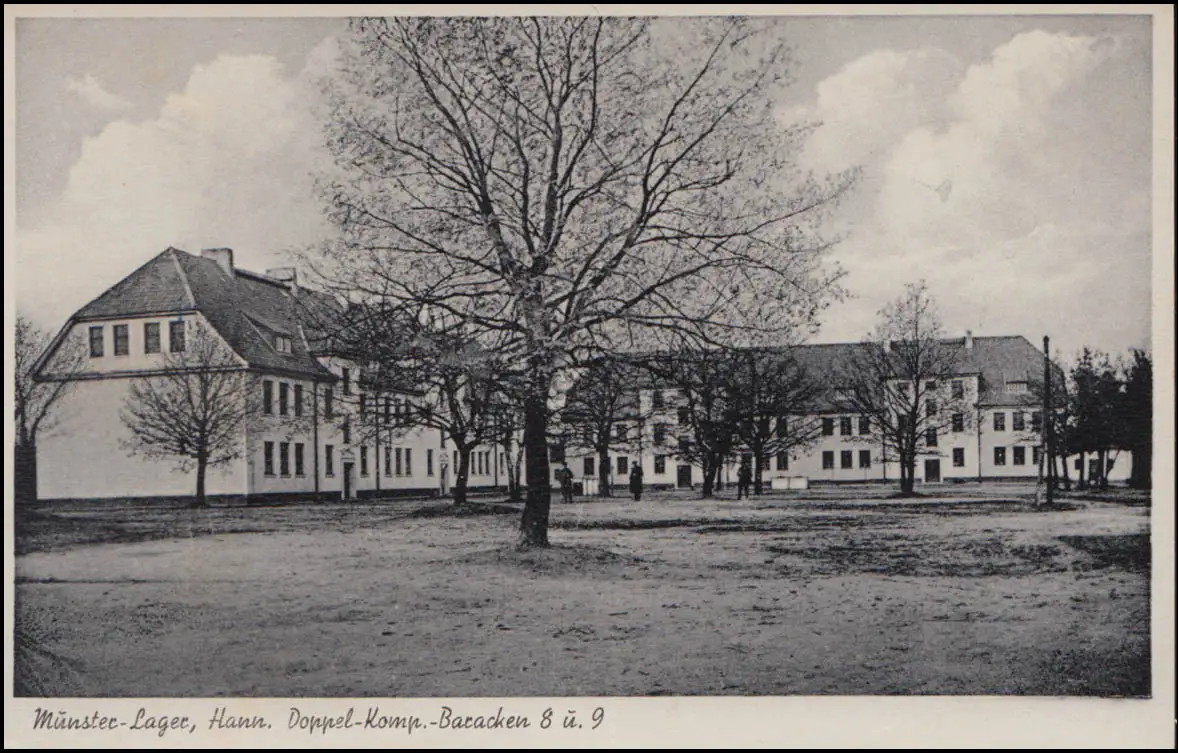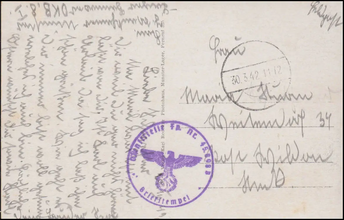 Poste de terrain BS 45898 D, timbre camouflage 30.3.1942 sur AK Munster-Stager Baracken 8 et 9