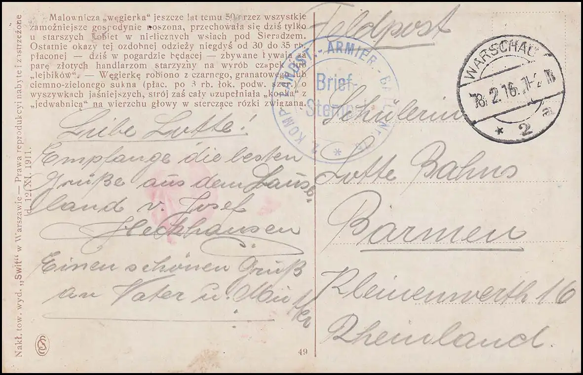 Poste de terrain BS Landsturm-Armungs-B. Varsovie - 18.2.16 sur AK Femme en costumes