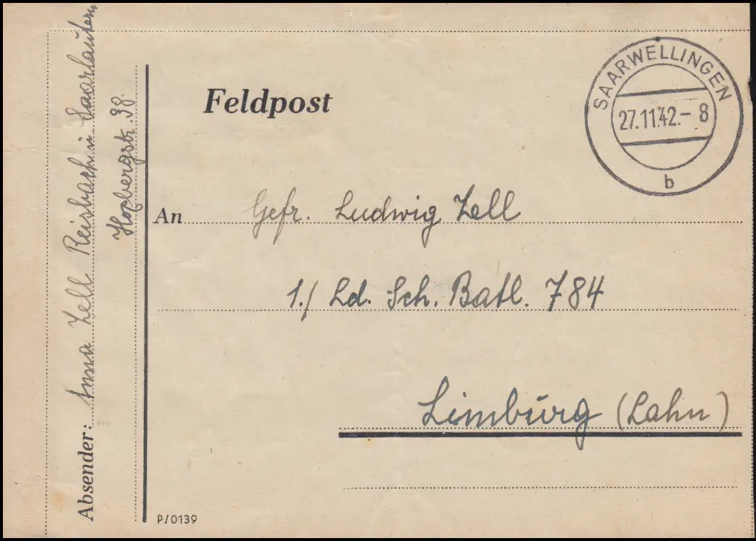 Lettre de champ-post SAARWELLINGEN 27.11.1942 vers le Limbourg - sans cachet