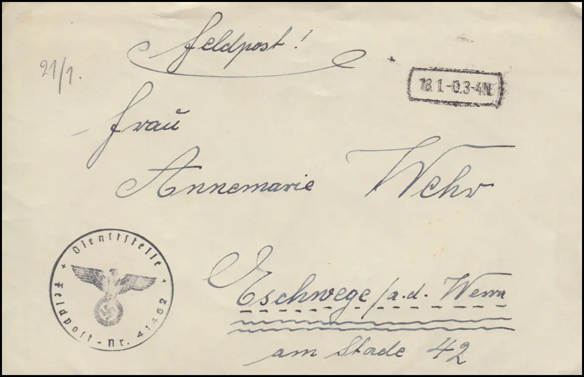 Poste de terrain 41462: 1. Compagnie de Sauveur-Designer 113, écrit dans Arys le 18.1.41 Examen: original Référence produit: 00000000022399