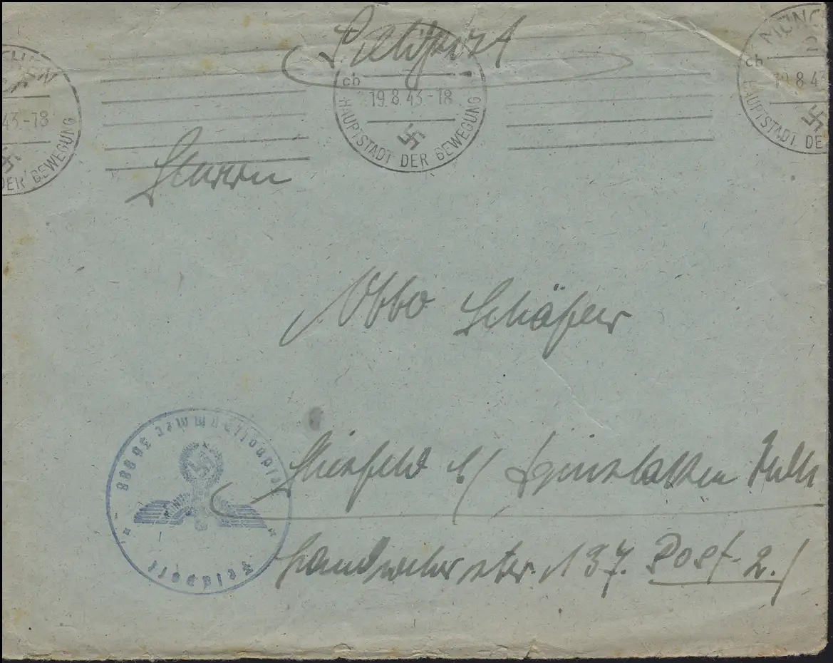 Poste de terrain numéro de champ postale 36888 Lettre MUNICH 19.8.1943 n. Steinfeld/Schmalkalden