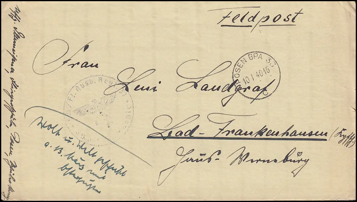 Feldpost Fl.-Formation-Ristient Bf. POSEN BPA - 10.1.40 n. Bad Frankenhausen