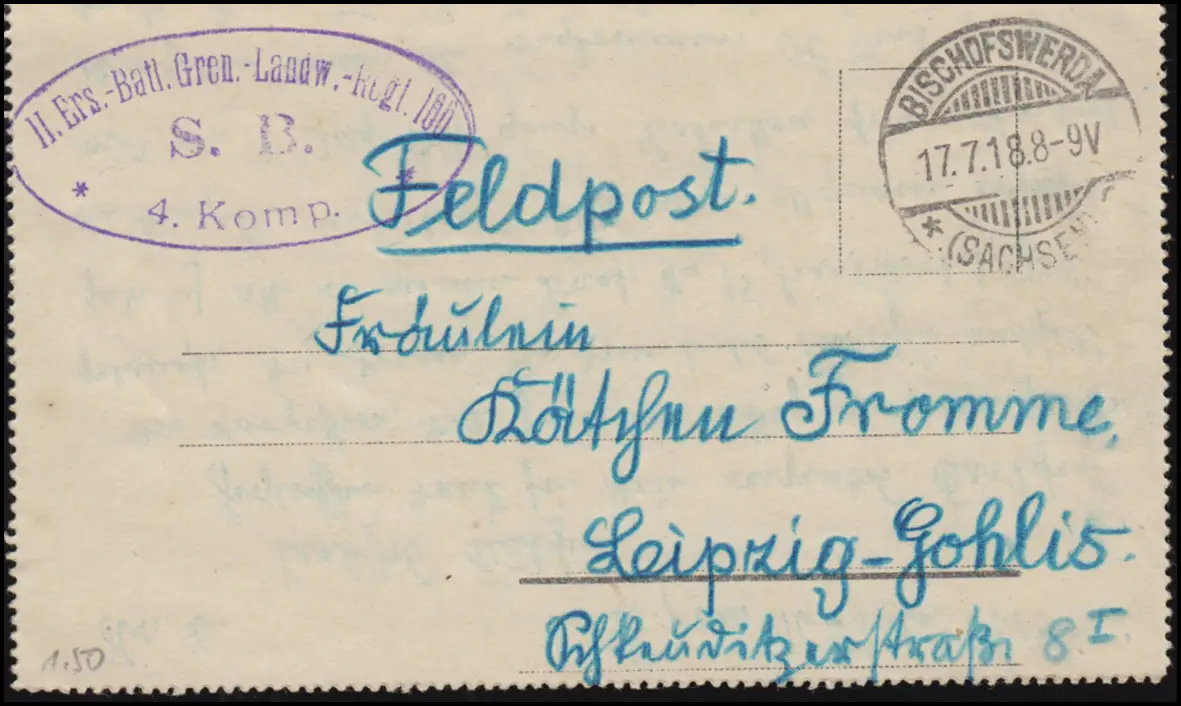 Poste II, Ers.-Batl. Gren. Landw. Regt.166, carte postale BISCHOFSWERDA 17.7.18