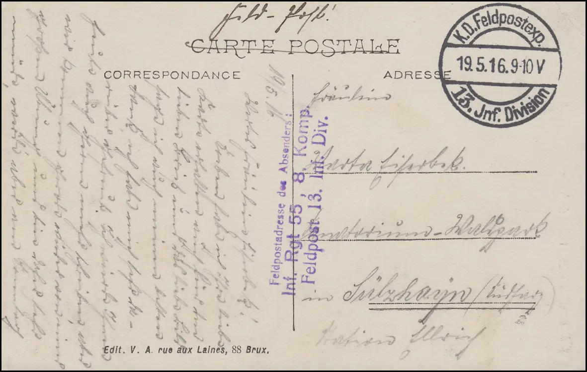 Feldpost Inf.-Reg. 55 sur AK Büssel Hotel de Ville, FELDPOST 13.Inf.Div. 19.5.16