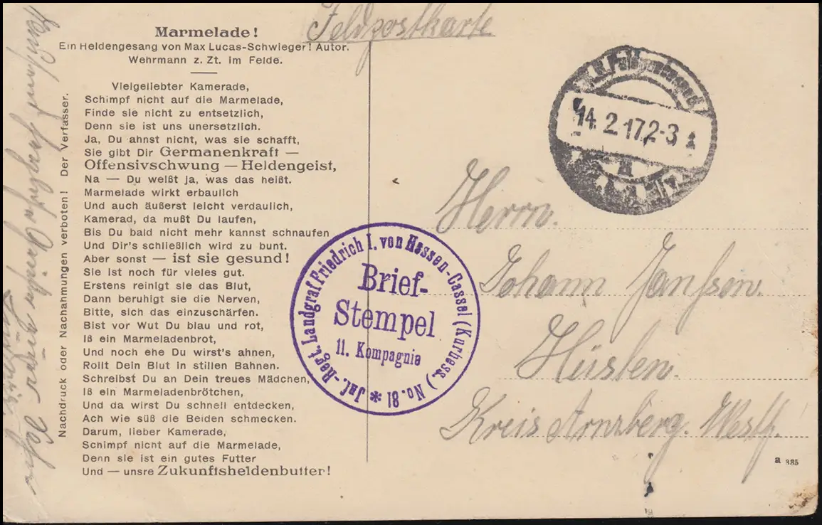 Feldpost Inf.-Regt. Landgraf Friedrich I. von Hesse-Cassel (Kurhess.) 14.2.1917