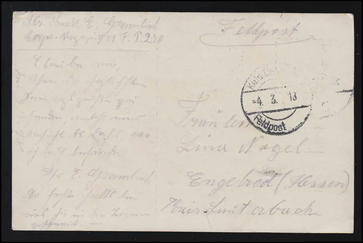 Poste de campagne Kaiserlich Deutsche Feldpost 230 - 4.3.18 AK Balkan village en hiver