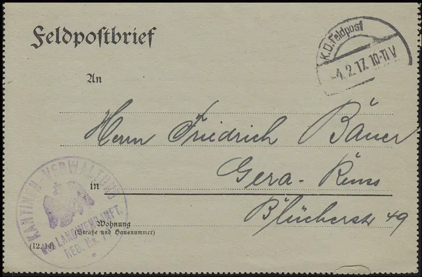 Poste de terrain Administration cantine du Landwehr-Inf.-Reg. no 21, FELDPOST 4.2.17