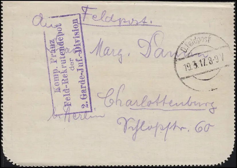 Feldpost Komp. Franz Field-Rekruten depot 2 division Garde-Inf., FELDPOST 19.3.17