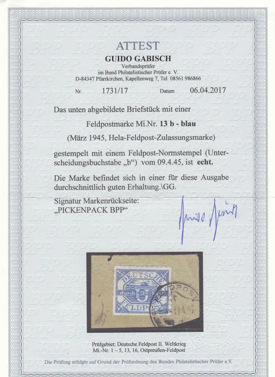 Poste de terrain: numéro 13b sur le colis, date 9.4.1945, BPP Attest