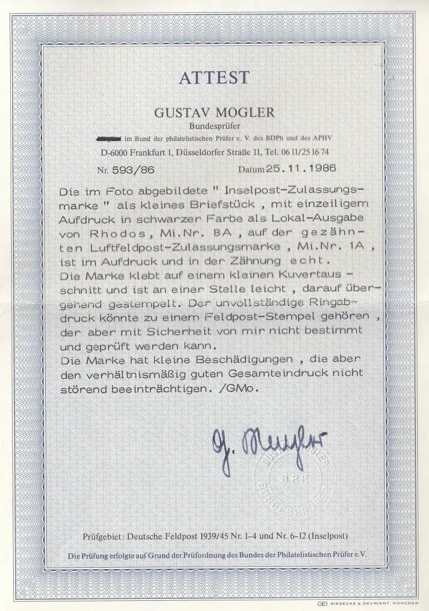 Poste de terrain: numéro 8A, cacheté, Rhodes, BPP Attest