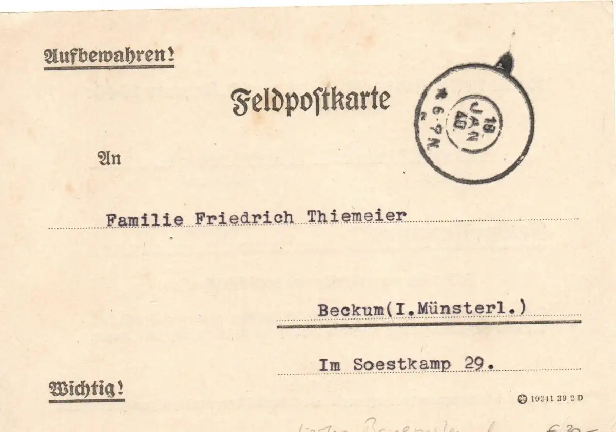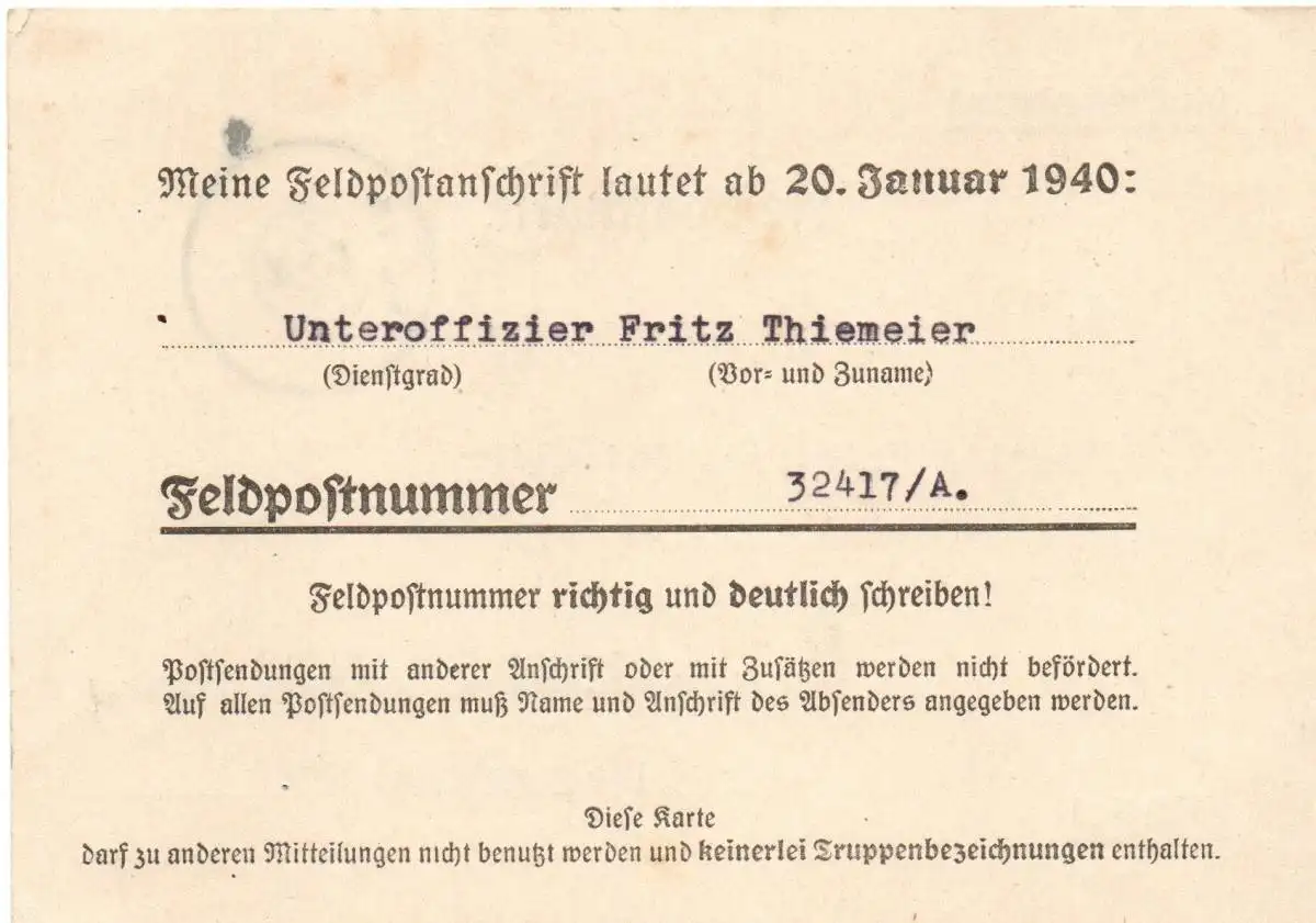 Feldpost: Mitteilung der Feldpostnummer: FPNr. 32417 nach Beckum