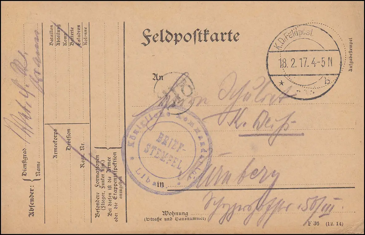 Poste de terrain S.B. Temple Commandant royal Libau, K.D. FELDPOST 18.2.1917