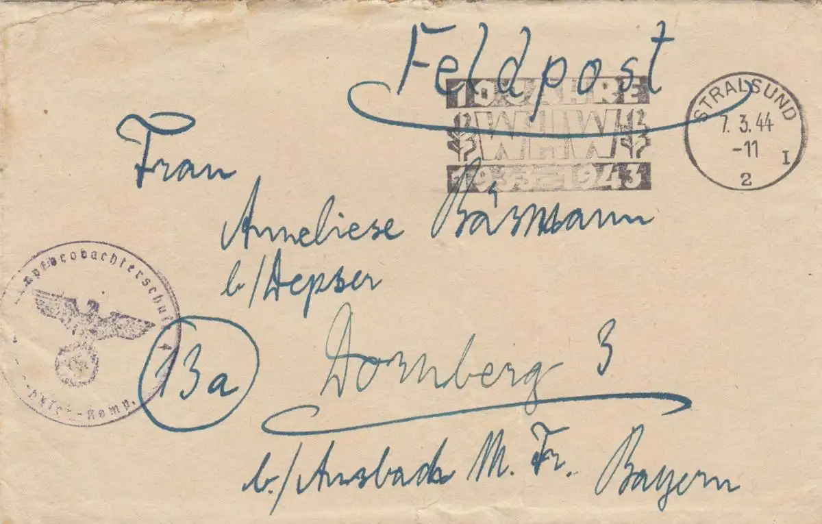 Feldpost Stralsund 1944 vers Dornsberg /Ansbach avec contenu de lettre, WHW 10 ans