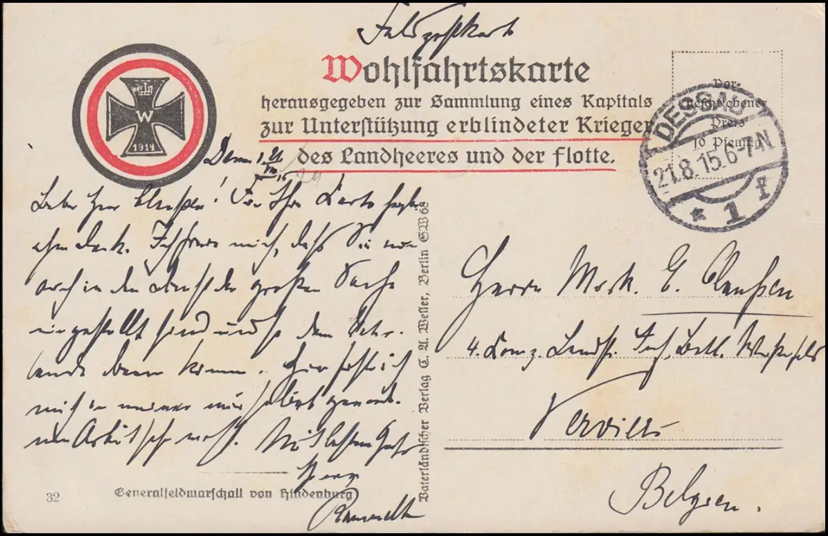 Feldpost Wundungs-AK Hindenburg, DESSAU 21.8.1915 vers la Belgique