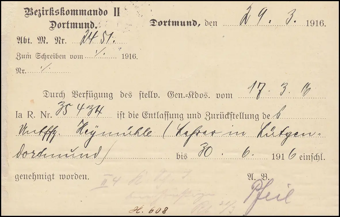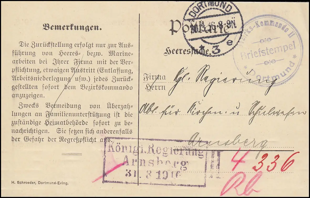 Feldpost commando II DORTMUND 30.3.16 à Königl. Gouvernement à Arnsberg