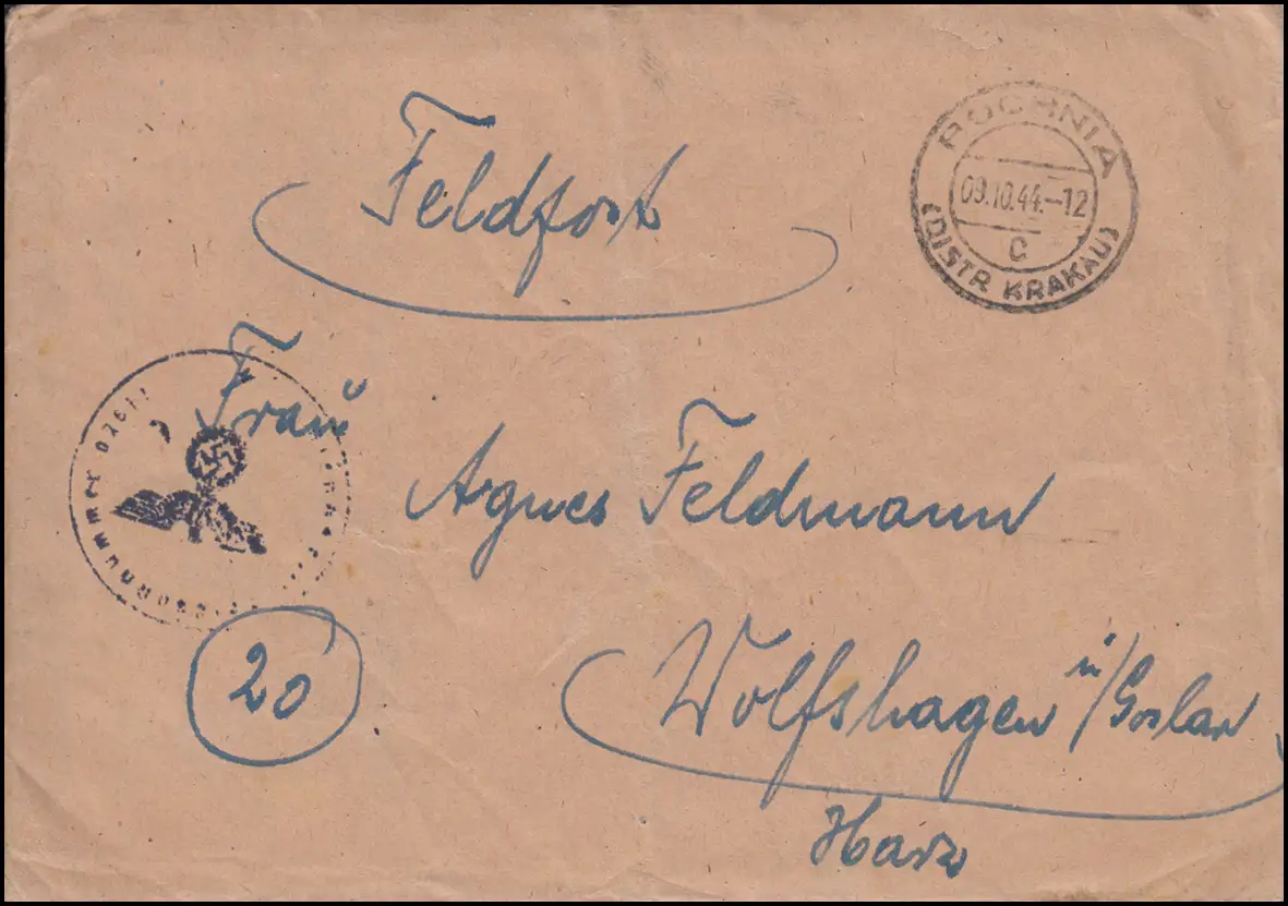 Poste de terrain avec BS sur lettre BOCHNIA (KRAKAU) 9.10.1944 à Wolfshagen