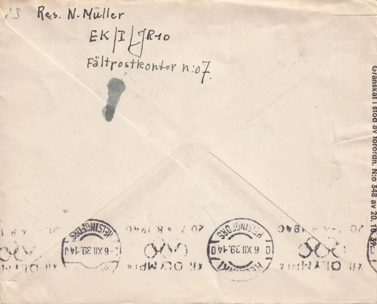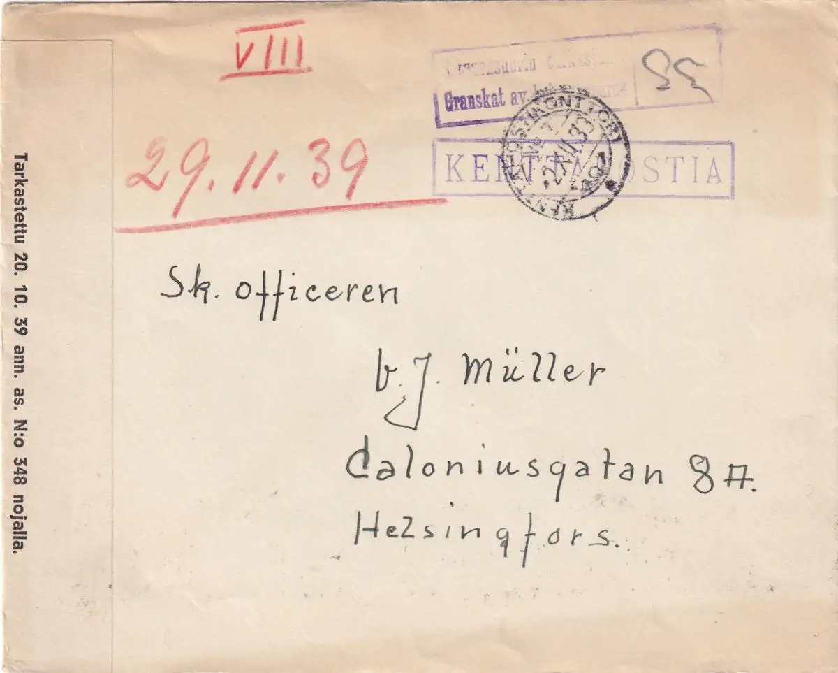 Lettre de la poste de terrain 29.2.1939 de Finlande, dt. soldat