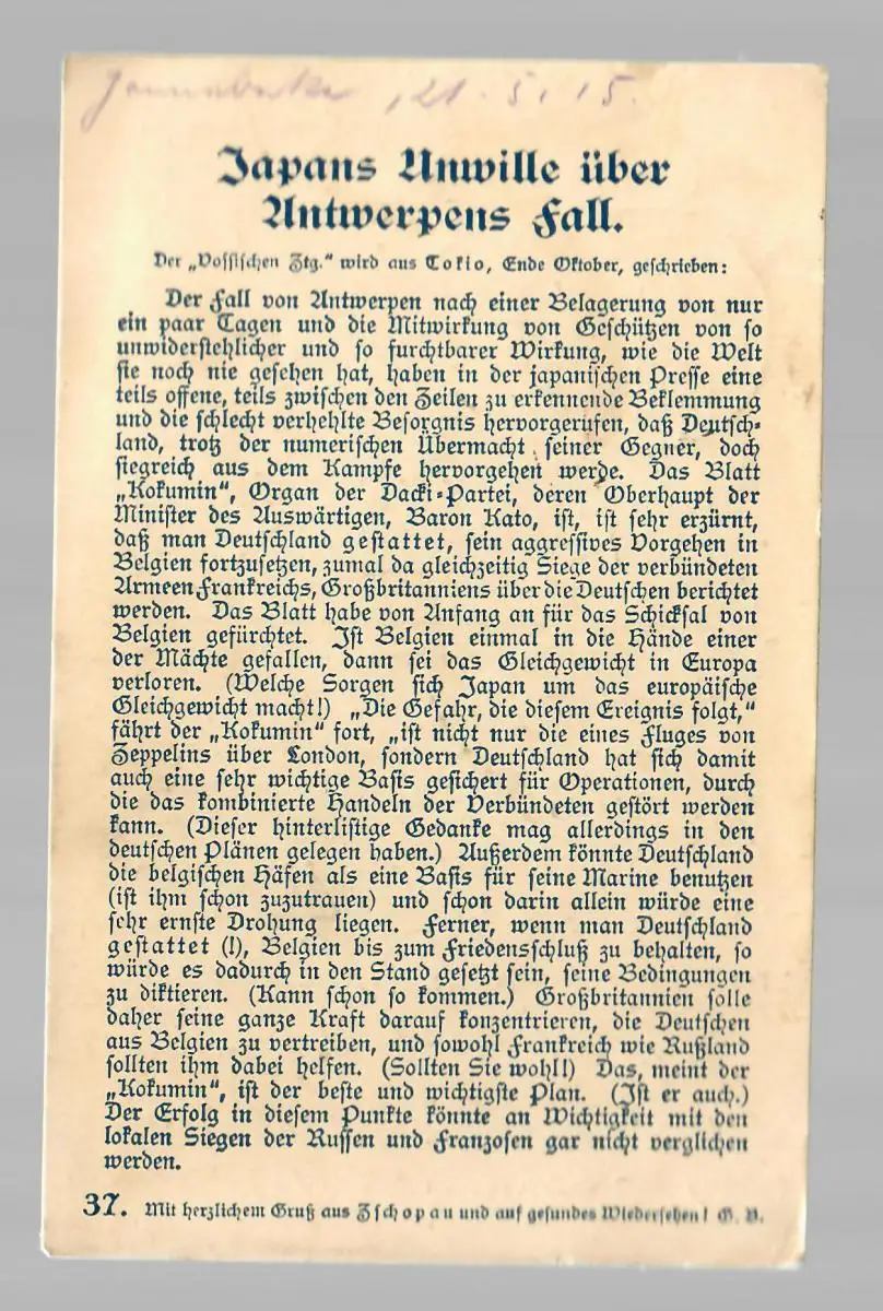 Carte postale de champ 1915 vers Zwickau: Texte: Désir du Japon sur le cas d'Anvers