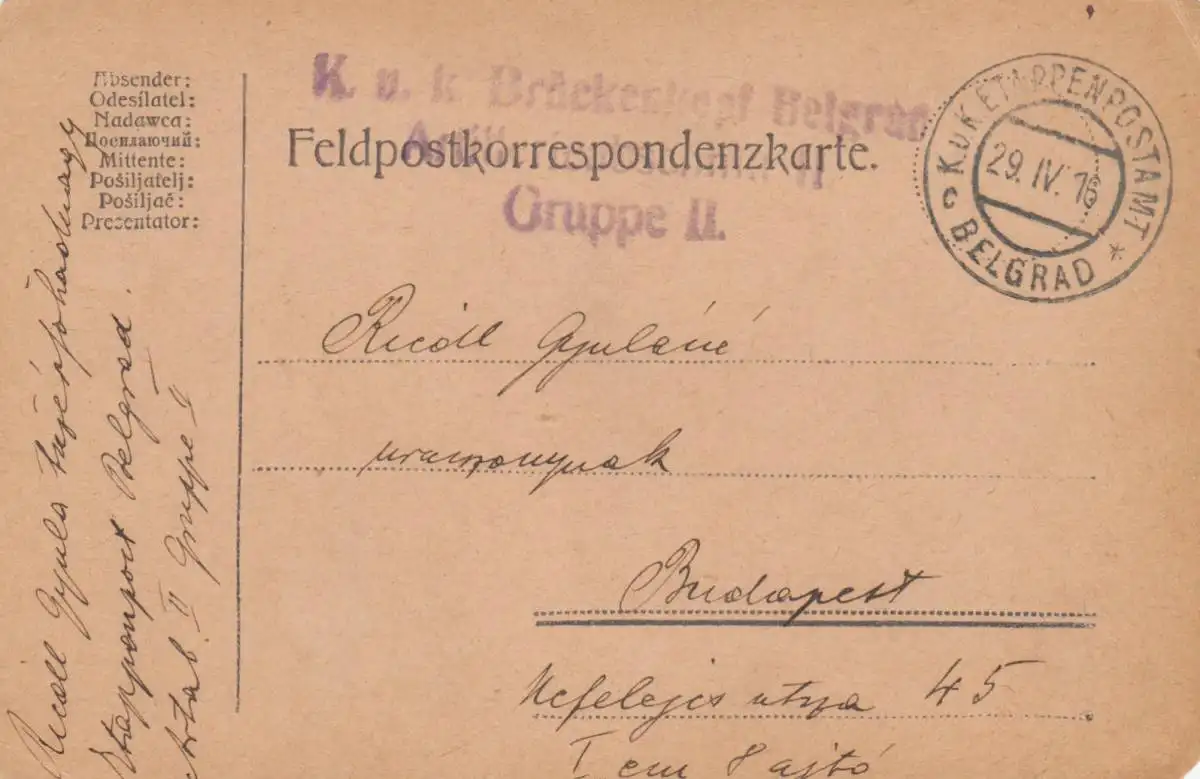 Carte postale de terrain 1916, Kuk Postal de Belgrade, Pont-de-Pont à Budapest