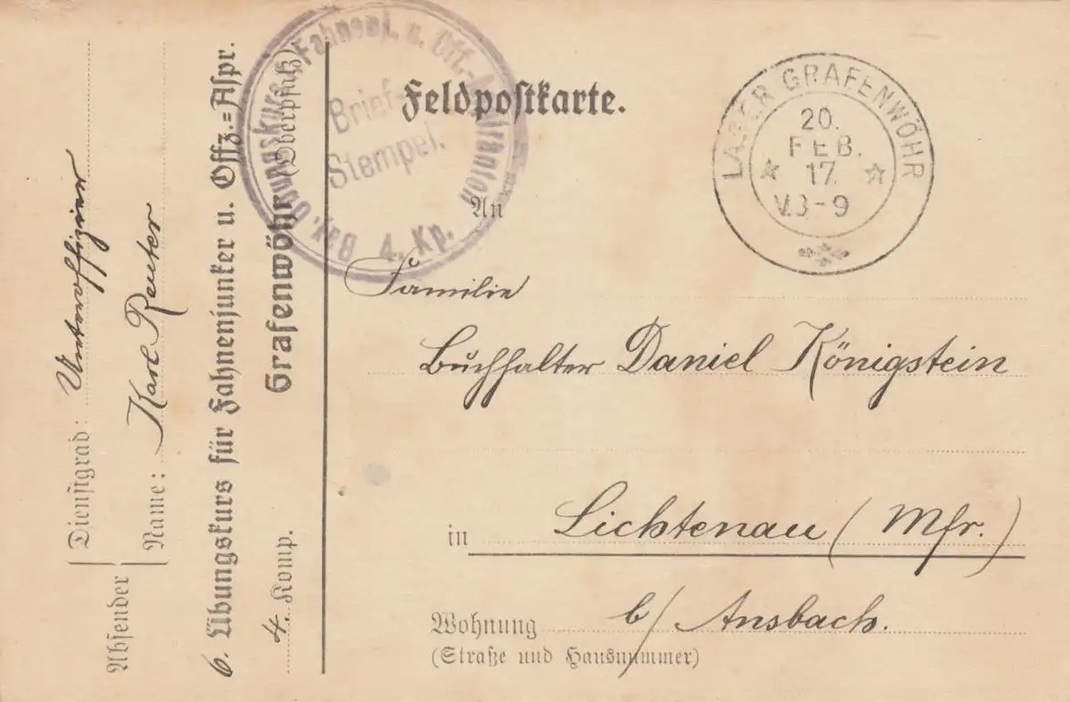 Carte postale de camp 1917 Gourdin des comtes, Bay. Cours d'entraînement pour junkers de drapeaux/Offiz. Anw.