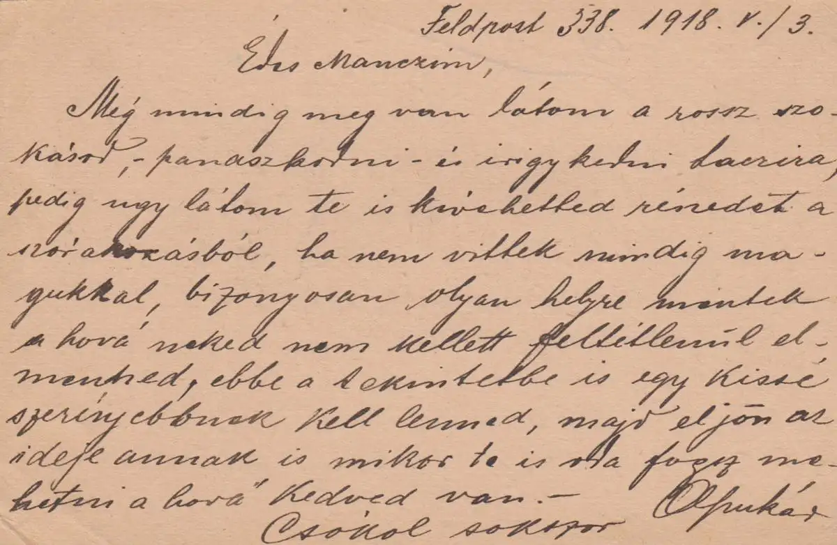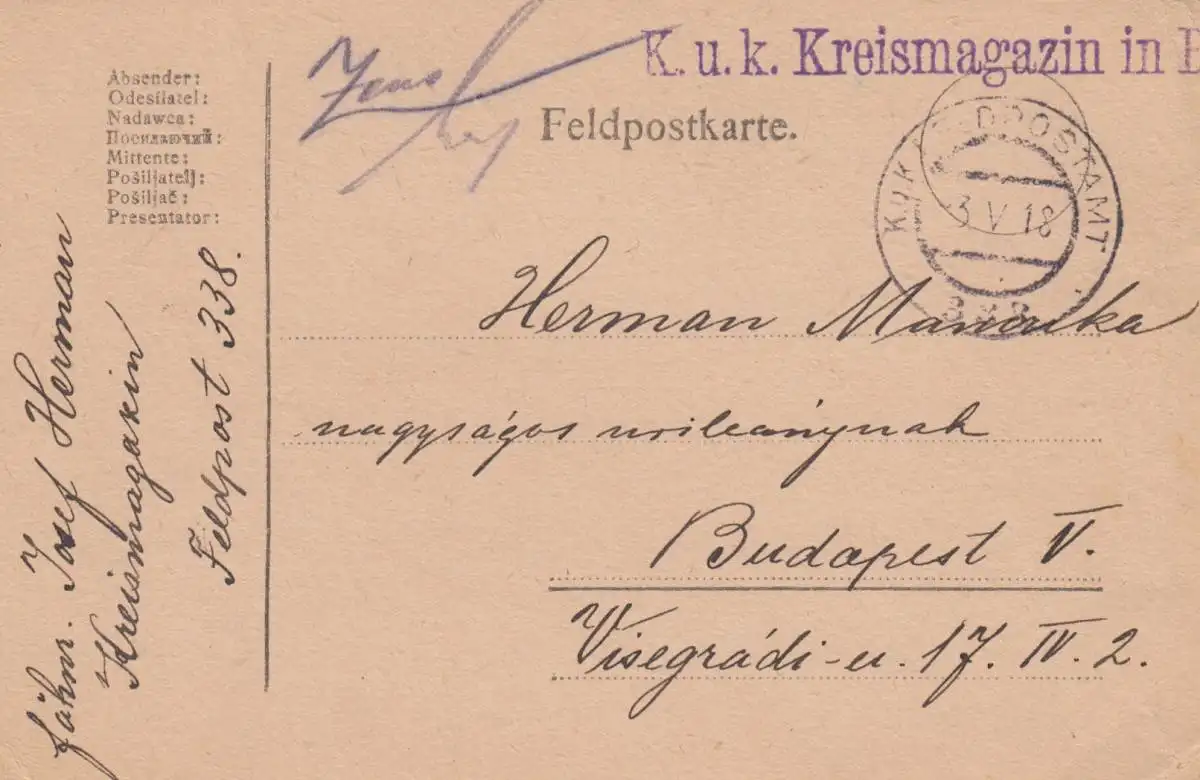 Carte postale de terrain 1918 Kuk Bureau de poste de campagne FP 338 à Budapest
