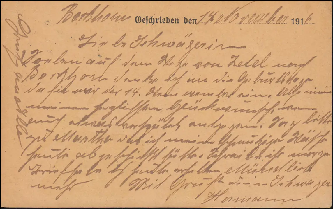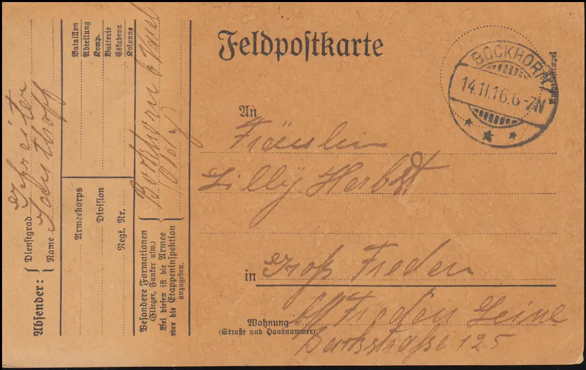 Carte postale de champ BOCKHORN 14.11.1916 vers Gross Freden