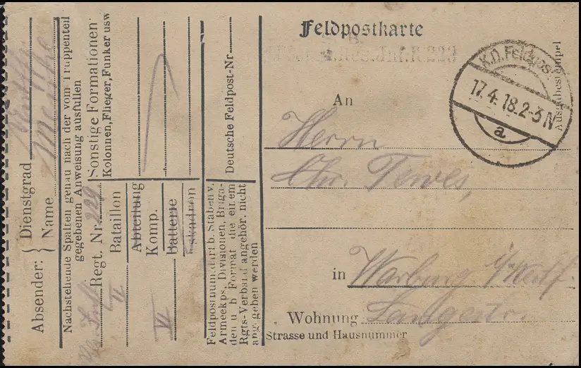 Carte postale de terrain B.S. ... Régiment d'infanterie en plein air 223, cachet aptisé 17.4.18
