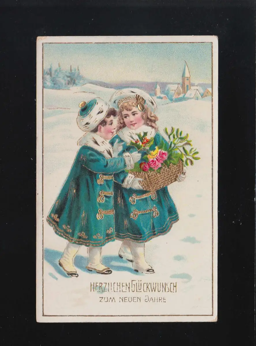 Félicitations pour la nouvelle année, les filles dans la neige apporter des fleurs Paunsdorf 1.1.112