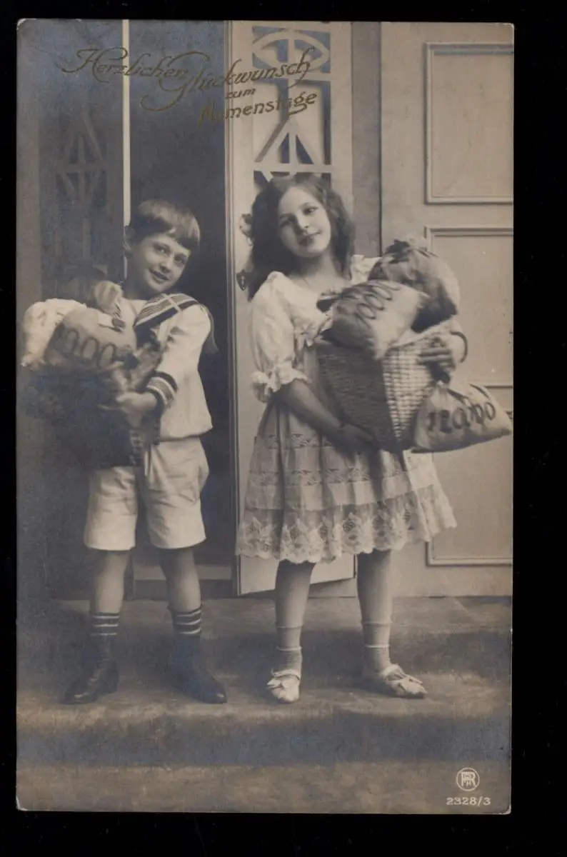 Félicitations pour les enfants-AK Journée de nom: Les garçons et les filles avec des sacs à main, QUATRE 1910