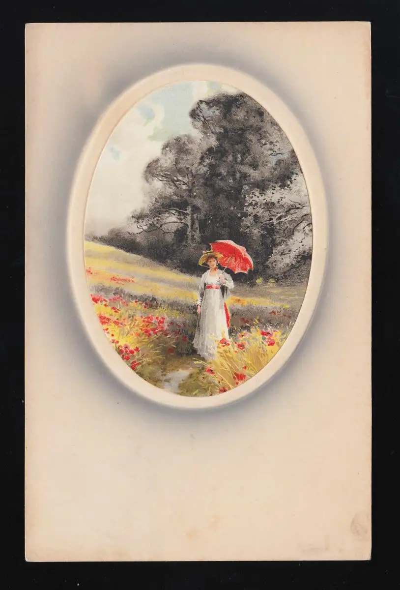 Femme avec parapluie rouge de pavots de champ peintures, cadre de médaillon Vienne vers 1908