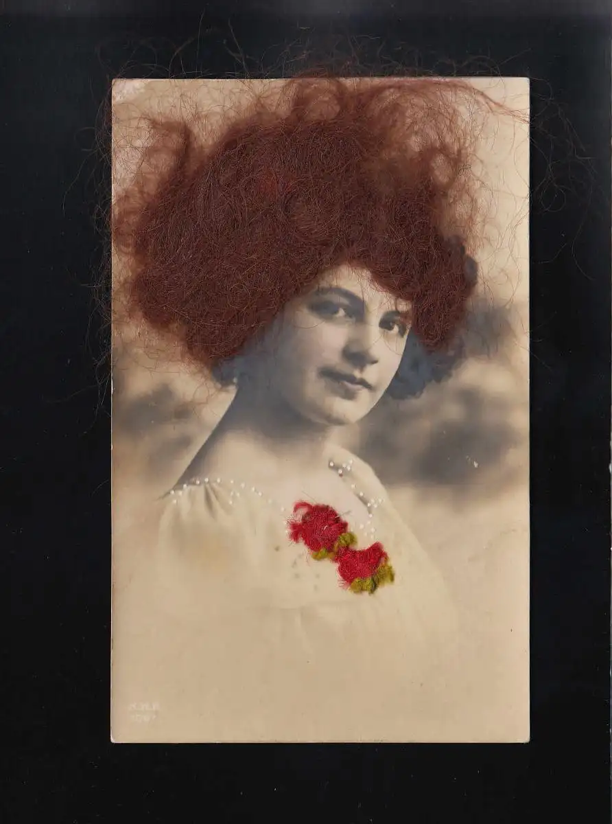 Femme brune cheveux vrais coiffure, fleurs rouges pierres décolleté, marqué