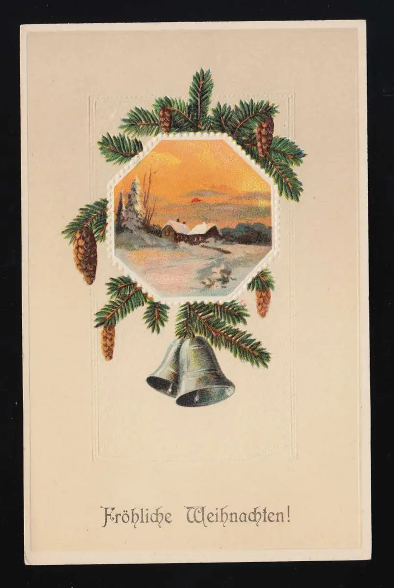 Ferme neige dans le rouge du soir, cloches rizières Joyeux Noël! inutilisé
