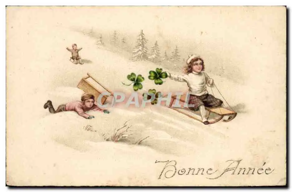 Fetes - Bonne Annee - trefle - luge - four leaf clover - sled - sport d&#39hiver - Cartes postales