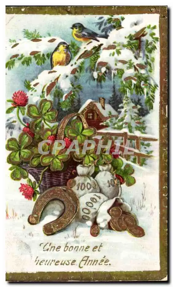 Fetes - Voeux - Bonne Annee - New Year - Horseshoe - four leaf clover - money - Cartes postales