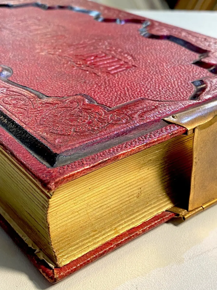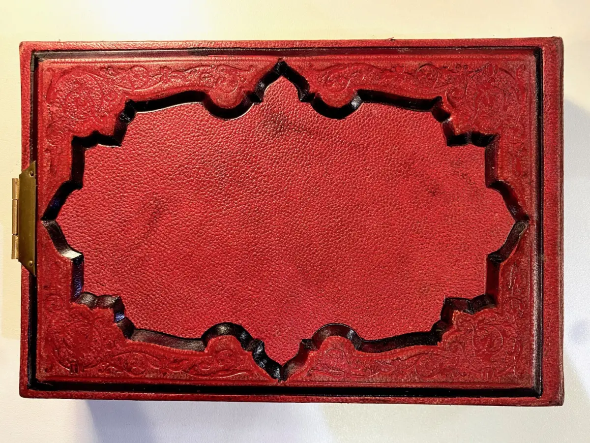 Belle reliure en cuir rouge à fermoir métallique, titré sur le premier plat