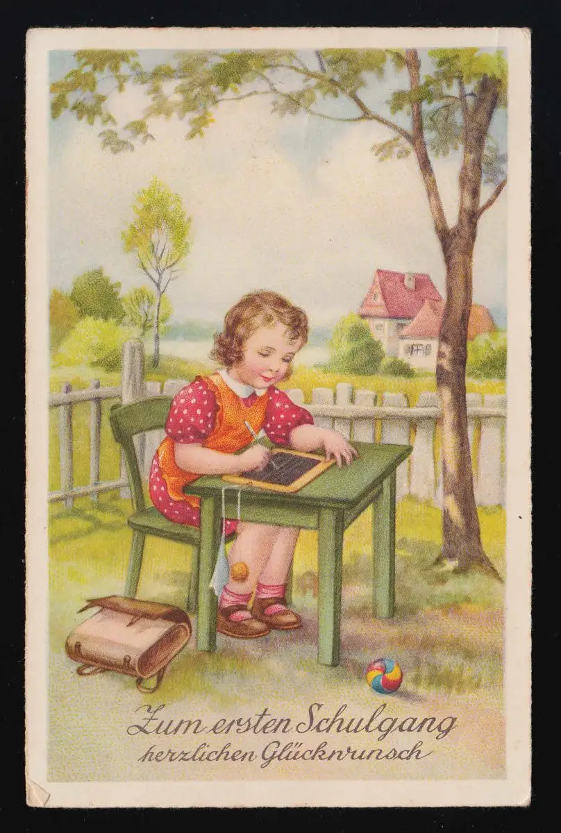 Fille assis sur le banc dans le jardin écrit sur la tablette d'ardoise, couru 27.3.1940