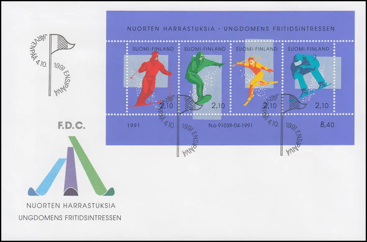 Finlande Bloc 8 ski alpin 1991 bijoux FDC ESSt Slalom et tige 4.10.90