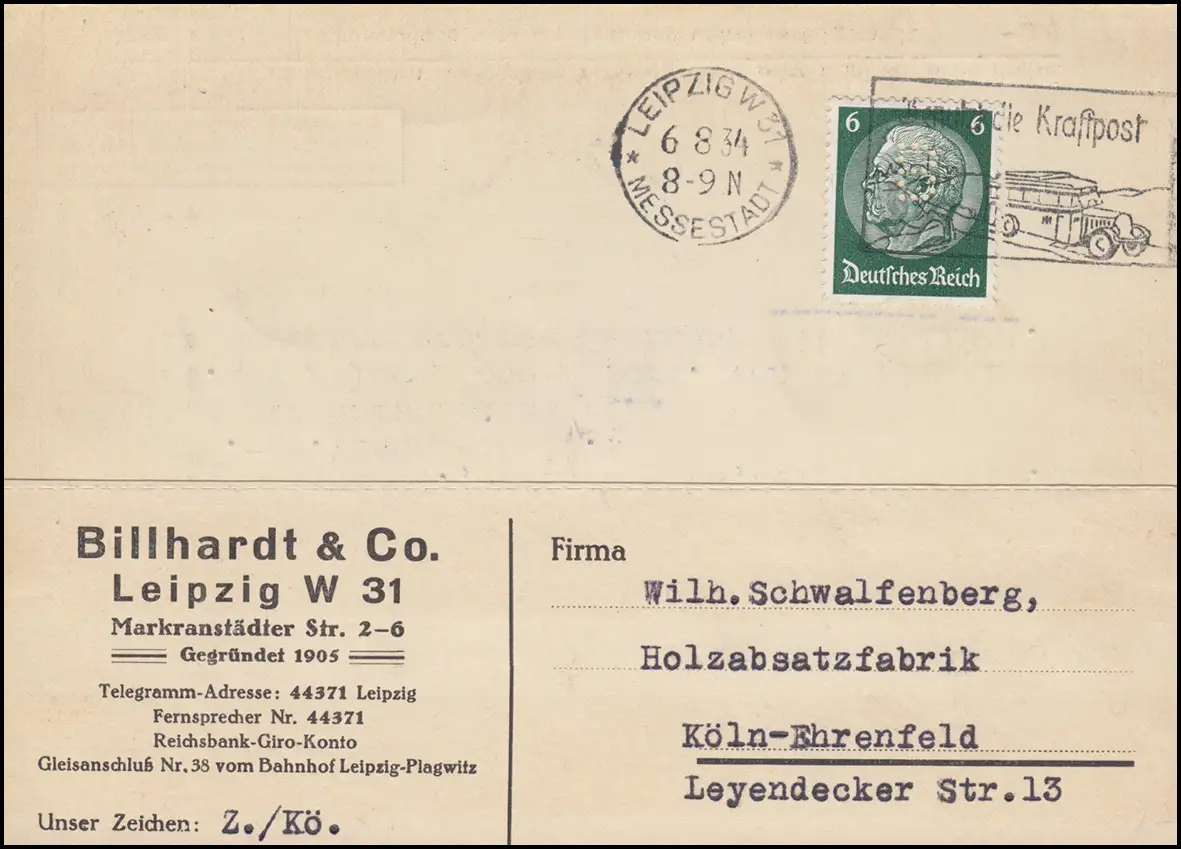 Trou de l'entreprise B sur Hindenburg 6 Pf en tant que EF sur carte postale à distance LEIPZIG 6.8.34